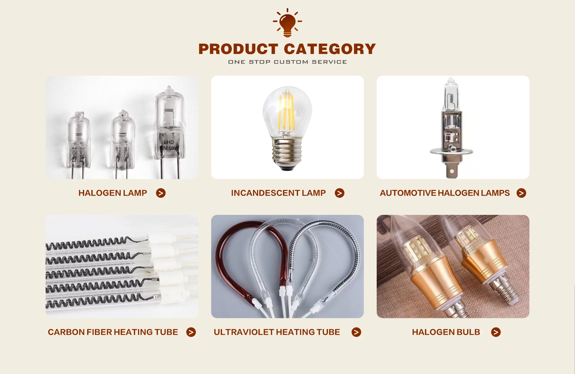 Productos principales:Lámpara halógena, lámpara halógena G4, lámpara halógena G8, lámparas halógenas automotrices, tubo de calefacción de fibra de carbono